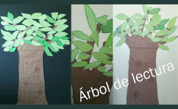 Junior 5 comenzó un nuevo proyecto de lectura: Cada alumno selecciona un libro para llevarse y leer en su casa. Al finalizarlo responde un breve cuestionario oralmente y comparte su opinión sobre el libro. A cambio recibe una hoja que forma parte del Árbol de lectura del aula.
