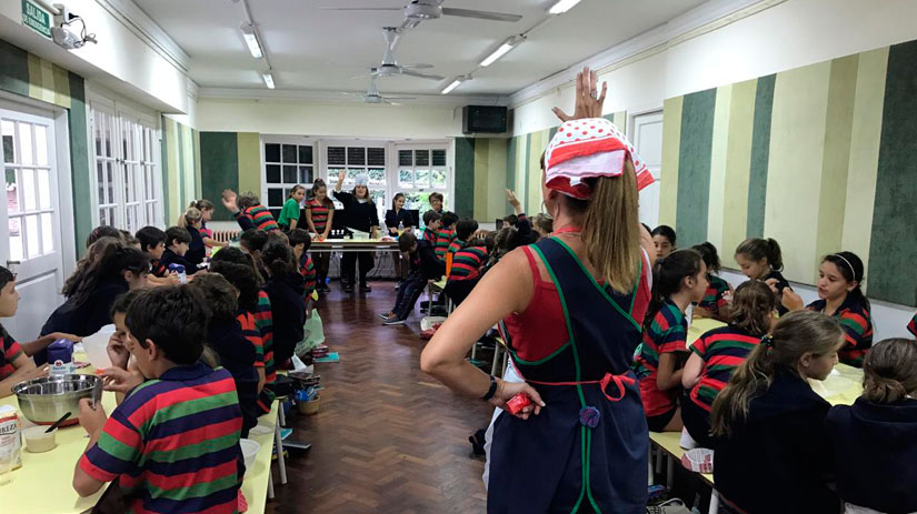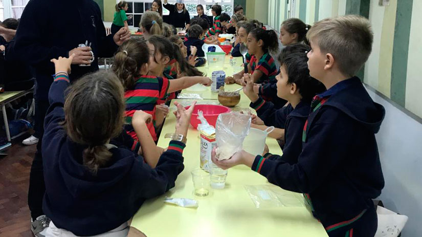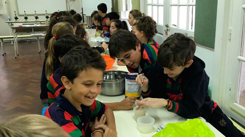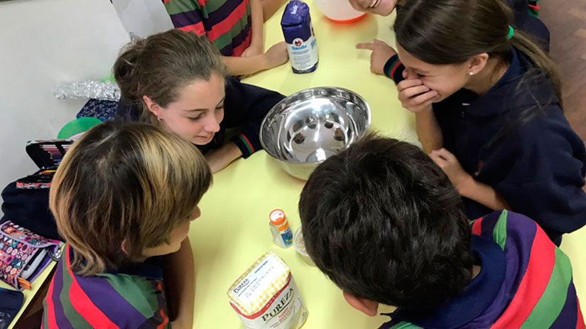 Los alumnos de Junior 5 están aprendiendo sobre células y microorganismos. Para trabajar el tema amasaron pan de pizza y estudiaron cómo la levadura se alimenta y respira. También observaron células animales y vegetales con los microscopios.