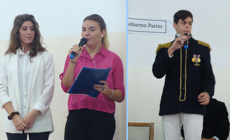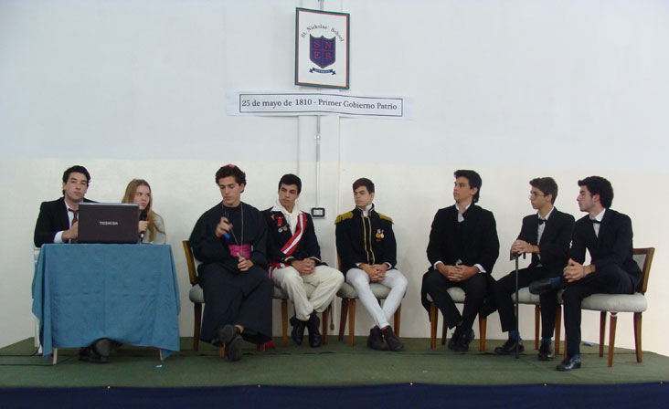 Los alumnos de S6 sorprendieron con su recreación de los sucesos de la Semana de Mayo de 1810 en formato de noticiero televisivo. La idea fue invitar al público a revisar los acontecimientos históricos en forma amena e interesante y con un lenguaje actual. La ocurrente representación incluyó anacronismos que combinaron pasado y presente valiéndose de elementos como notas a los cabildantes del 22 de mayo, móviles exteriores en vivo desde la Plaza de Mayo, avisos de auspiciantes, tweets de televidentes, pronóstico del clima y la noticia de “Último Momento”: ¡Aprobación de la Primera Junta Patria!
