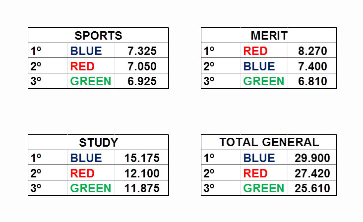 Tenemos el agrado de compartir con las familias del Colegio los puntajes finales alcanzados durante el año por los Houses: Red, Green, Blue.
